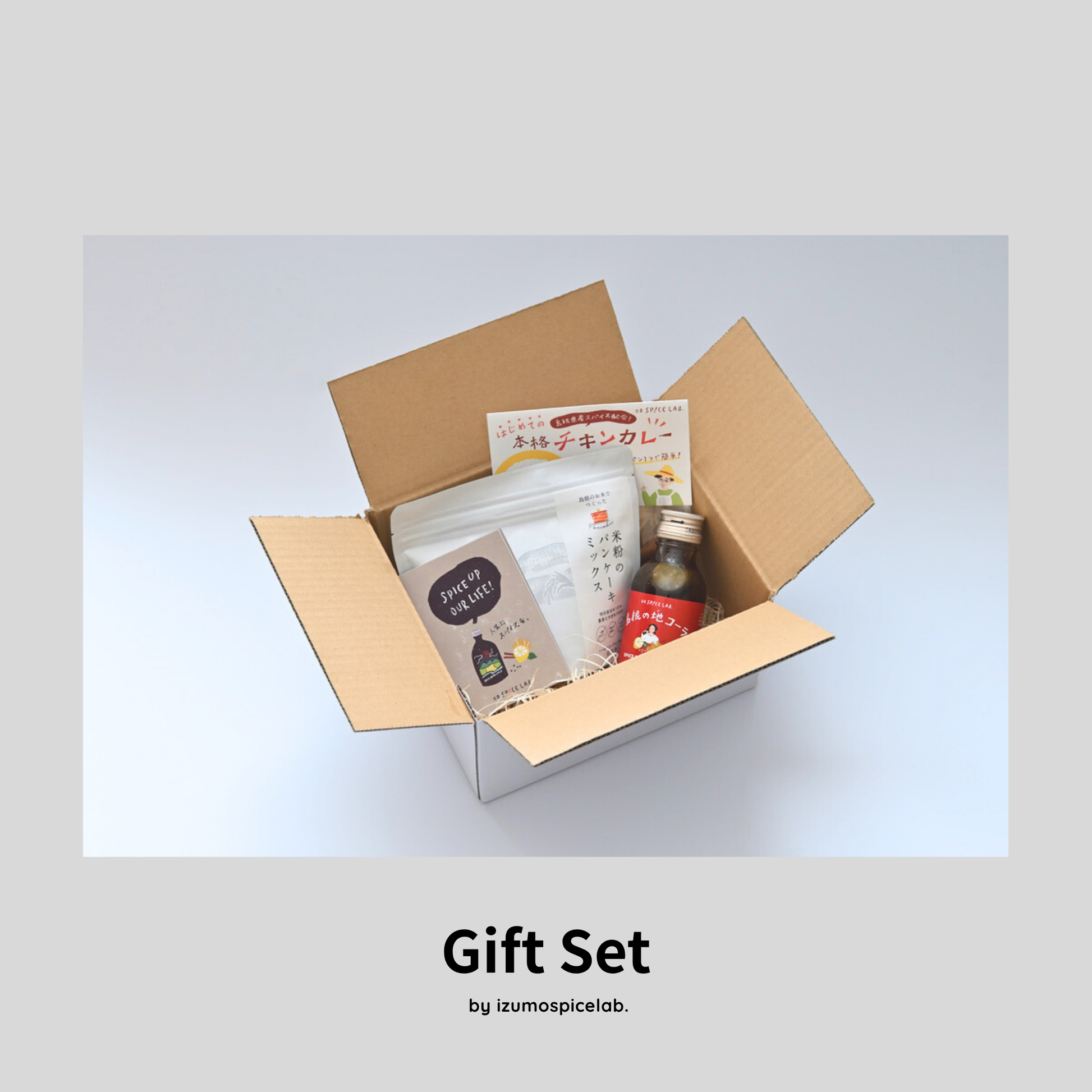 出雲SPICELAB.のスパイスカレーキット、スパイスドリンクシロップと、宮内舎の米粉のパンケーキを詰め合わせたギフトセットです。大人から子どもまで楽しんでいただける内容になっております。